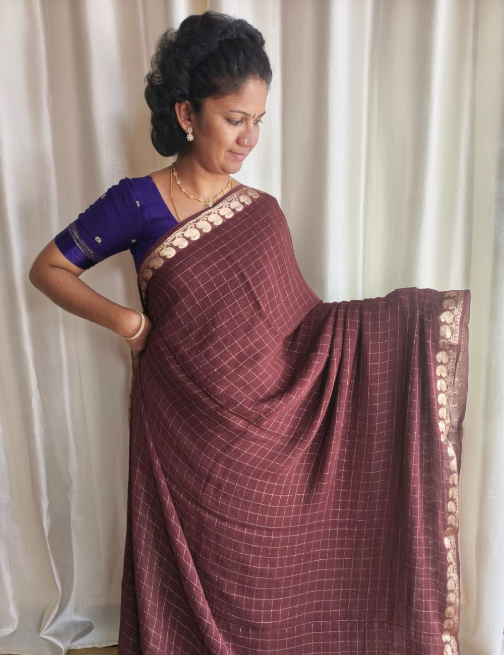 Premium Viscose Georgette Saree checks zari With Dola Viscose Blouse Chocolate Brown