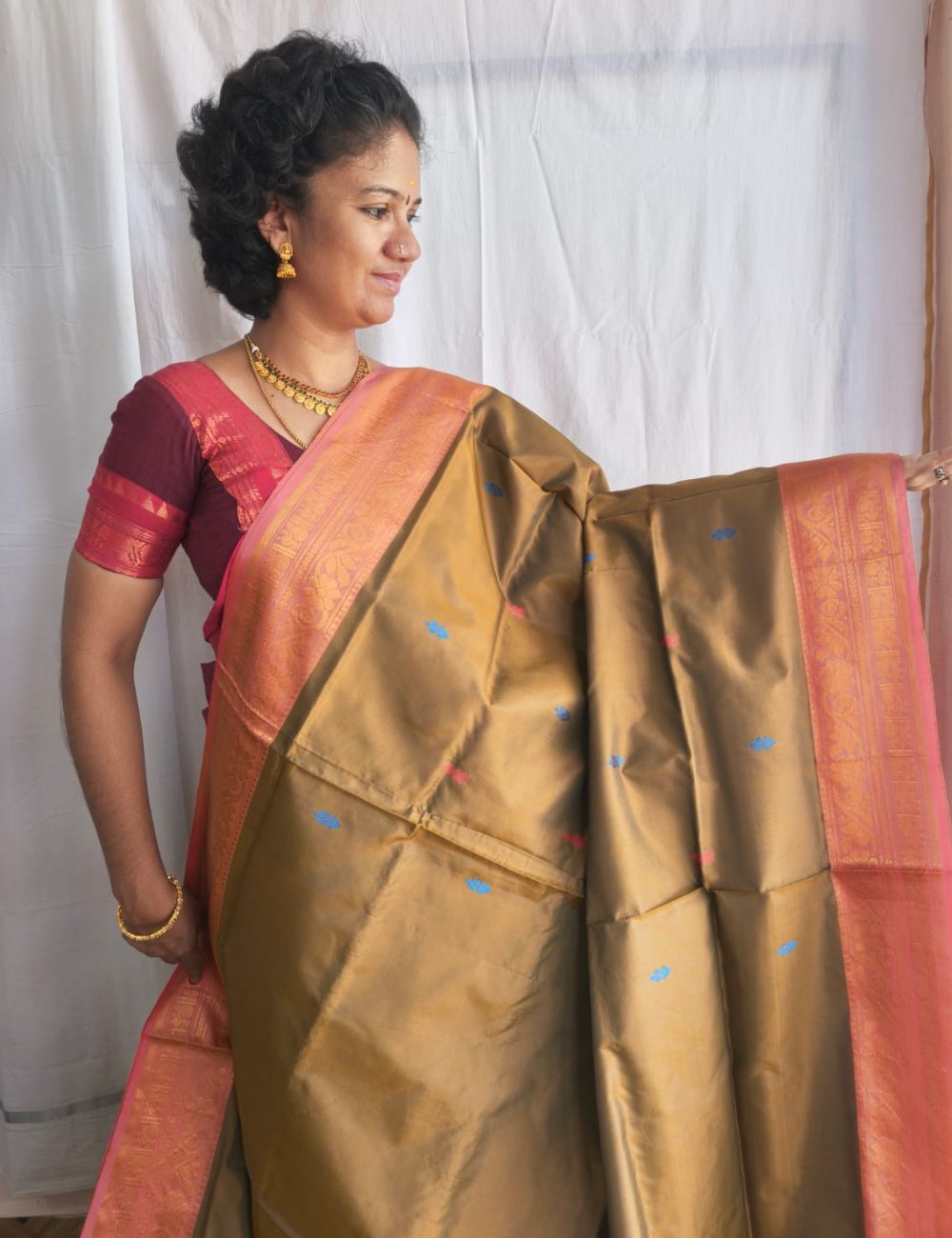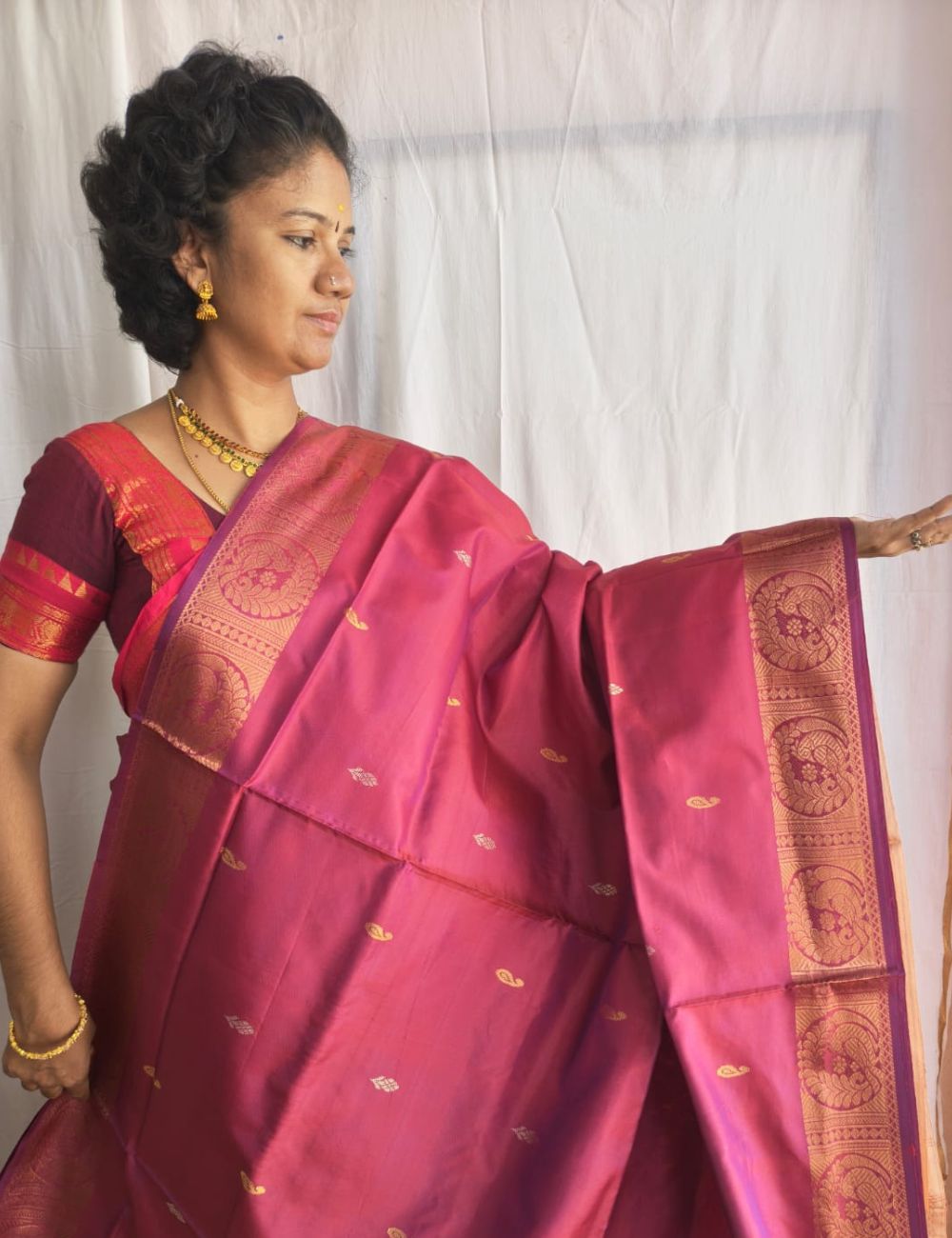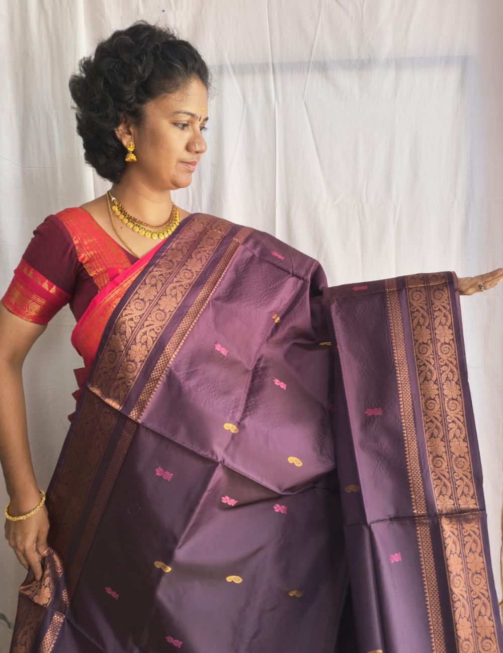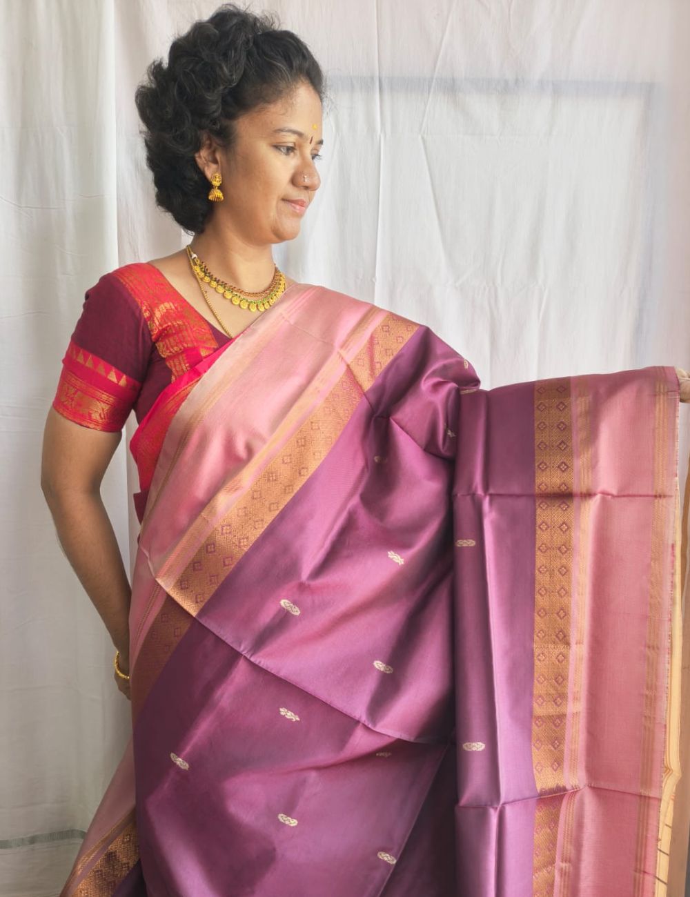 Vaazhai Naar Pattu saree with Brownish purple and yellowish green combination with traditional border and tussels.