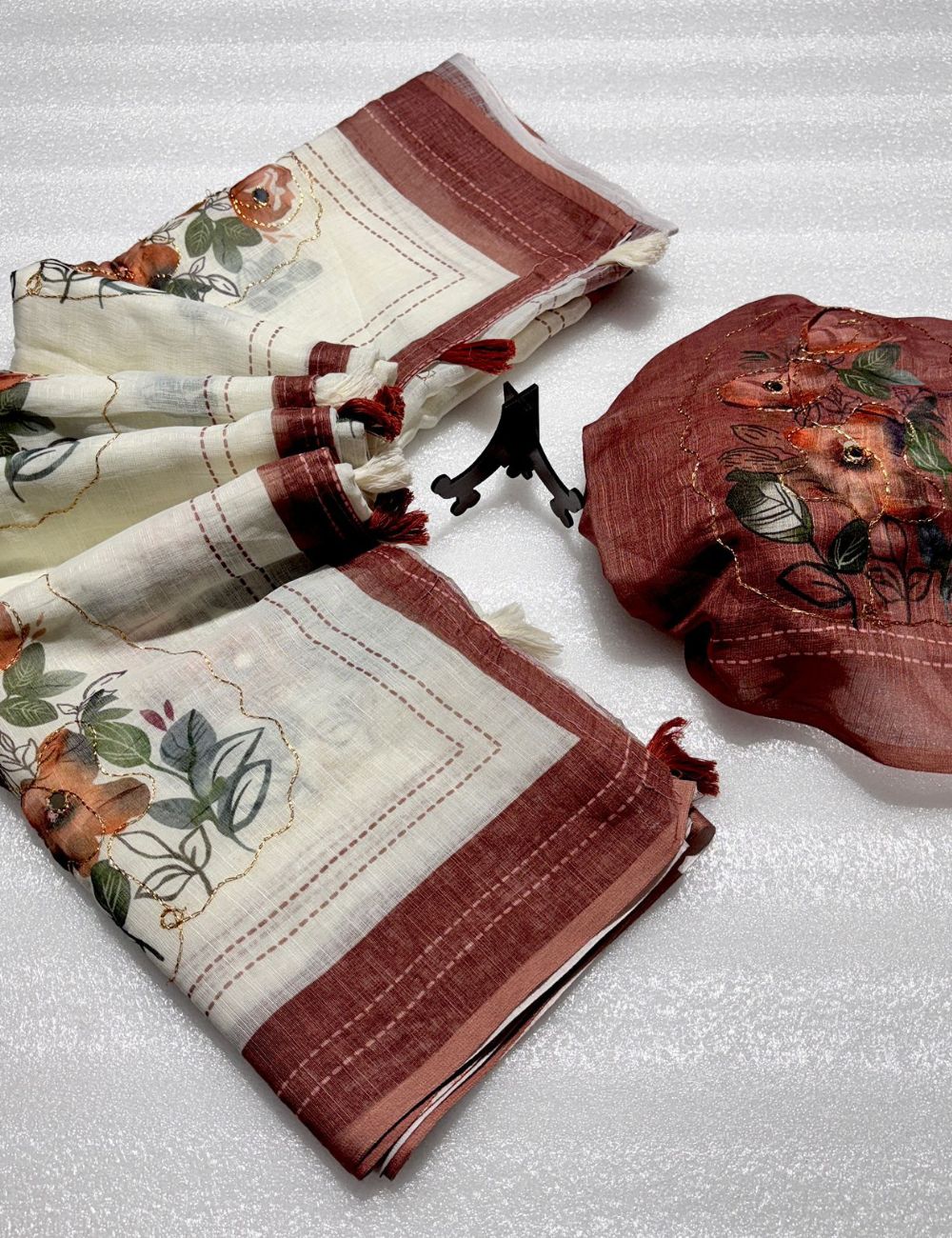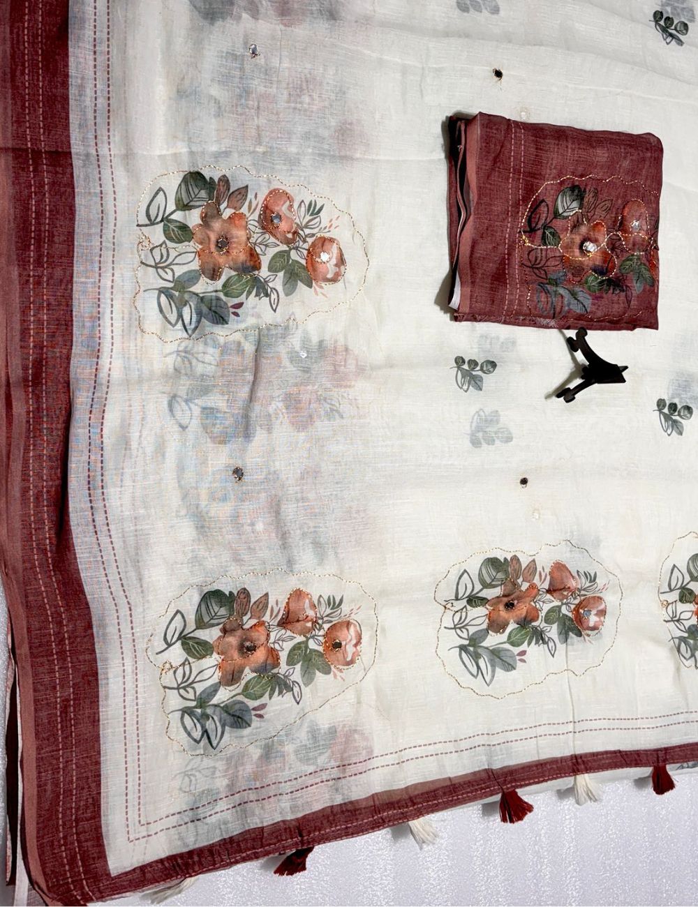 Kantha embroidery linen saree (pastel brown)